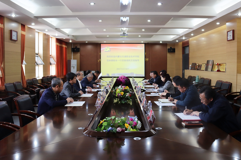 2021年4月14日上午,內(nèi)蒙古交通職業(yè)技術(shù)學(xué)院院長(zhǎng)范體貴、副院長(zhǎng)鄭廣軍帶領(lǐng)黨政辦公室、教務(wù)處、招生工作處、教學(xué)培訓(xùn)實(shí)習(xí)部等部門負(fù)責(zé)人來我院考察交流。學(xué)院黨委書記孫智憑會(huì)見了范體貴院長(zhǎng)一行。學(xué)院黨委副書記、院長(zhǎng)白托婭,副院長(zhǎng)孫恒及相關(guān)職能部門負(fù)責(zé)人與范體貴院長(zhǎng)一行在A439會(huì)議室進(jìn)行了座談交流。