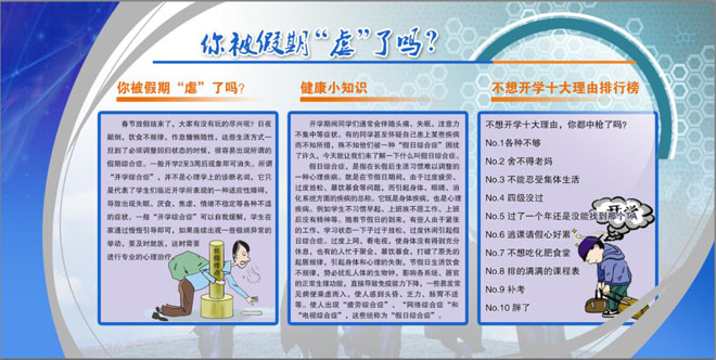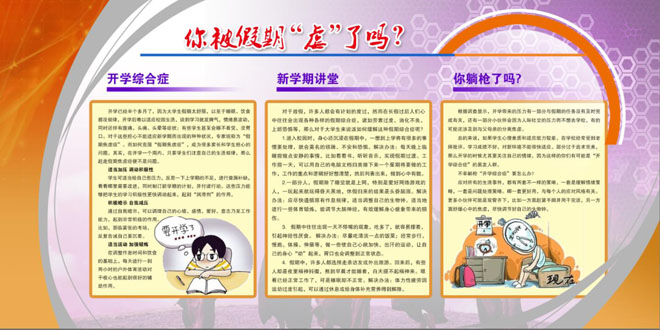 針對部分學(xué)生的“開學(xué)綜合癥”問題,學(xué)工處(團(tuán)委)通過宣傳展板,引導(dǎo)學(xué)生積極調(diào)整學(xué)習(xí)時間,樹立學(xué)習(xí)目標(biāo),促使學(xué)生盡快進(jìn)入學(xué)習(xí)狀態(tài)。