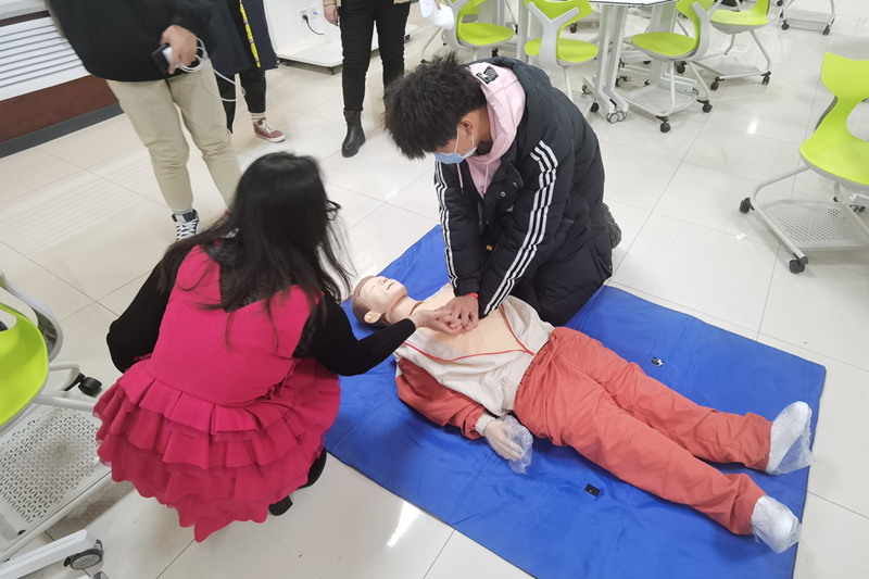 并就心肺復(fù)蘇的具體操作方法進(jìn)行了講解和示范,查看“患者”意識(shí)、觸摸頸動(dòng)脈、清除呼吸道異物、打開(kāi)氣道、胸外心臟按壓、施行人工呼吸等。工作人員現(xiàn)場(chǎng)和師生進(jìn)行互動(dòng),部分師生在工作人員的指導(dǎo)下進(jìn)行了實(shí)操,初步掌握了心肺復(fù)蘇的基本技能。